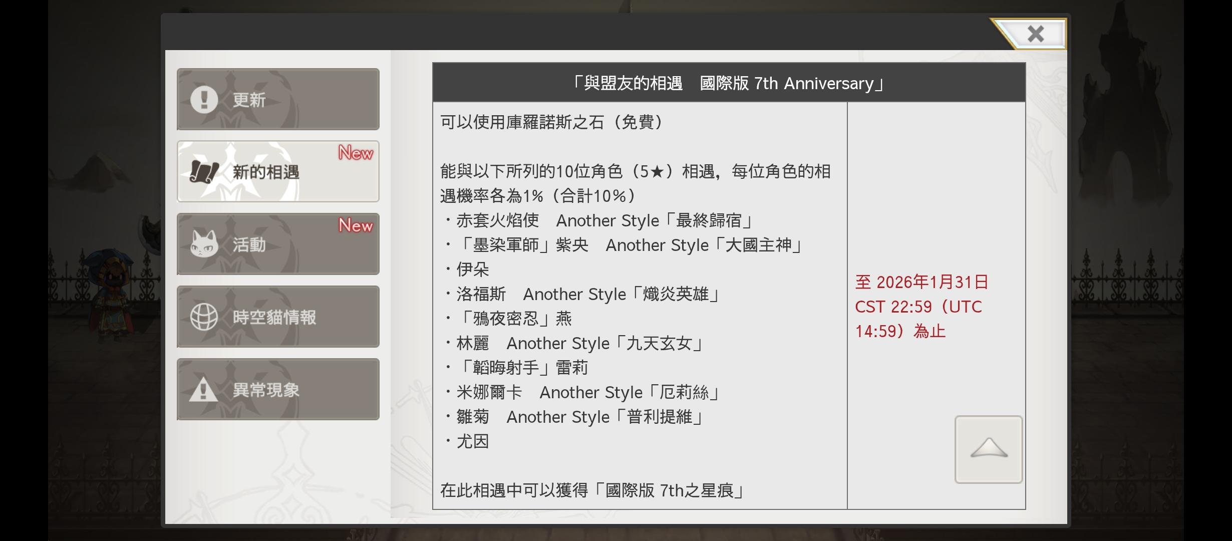 公告里不是说这个时间会有细雨可以抽吗?为什么我没看到,,目前主线推到了30多应该不是这个的问题吧,有这个卡池版本应该也对的上。 然后就是还有一个问题,有什么协奏之类的要尽快做的吗?我看有个什么sky结尾的好像是能给1k钻石来着