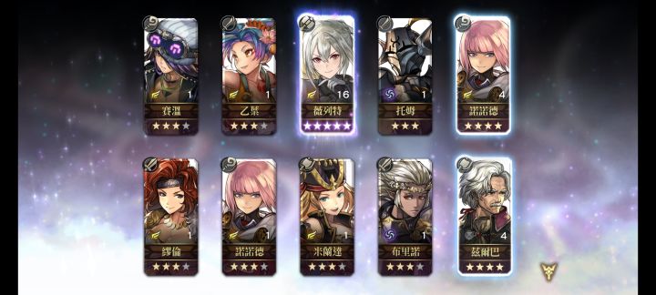 1w2,一共19个5星,补了5个new美丽特和艾妮都是1发出,周年池抽了1w,出了15个五星+水滴2,卡池10个角色抽出了9个。刀哥2次,伊朵3次,电锯2次,洛斯福2次,雷莉4次,火锤1次,炎拳1次,燕1次,林丽1次。