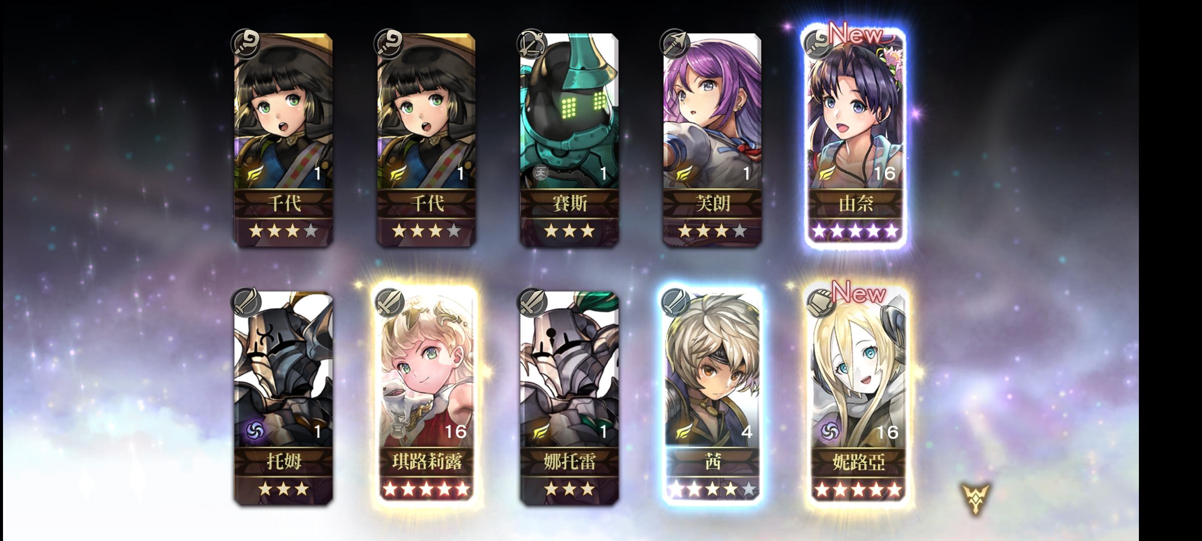 本來新卡池不敢抽怕給重複的(PART1米爾迪沒有,拉克萊兒差一個神偷俠盜典錄。PART2沒有蒼藍忠臣、妮路亞。只有五分之二的角色沒有,但是不敢抽,怕給重複的。我現在都被重複的給整怕了)3樓提到水滴我看了一下4000就給水滴還給4個天之指引錘給薇列特用。所以我想4000還是值得試一試,就抽4000,多了不抽。純粹就是運氣好,先抽3000Part2,先後出了蒼藍忠臣瓦雷斯、妮路亞(還給了由奈),再