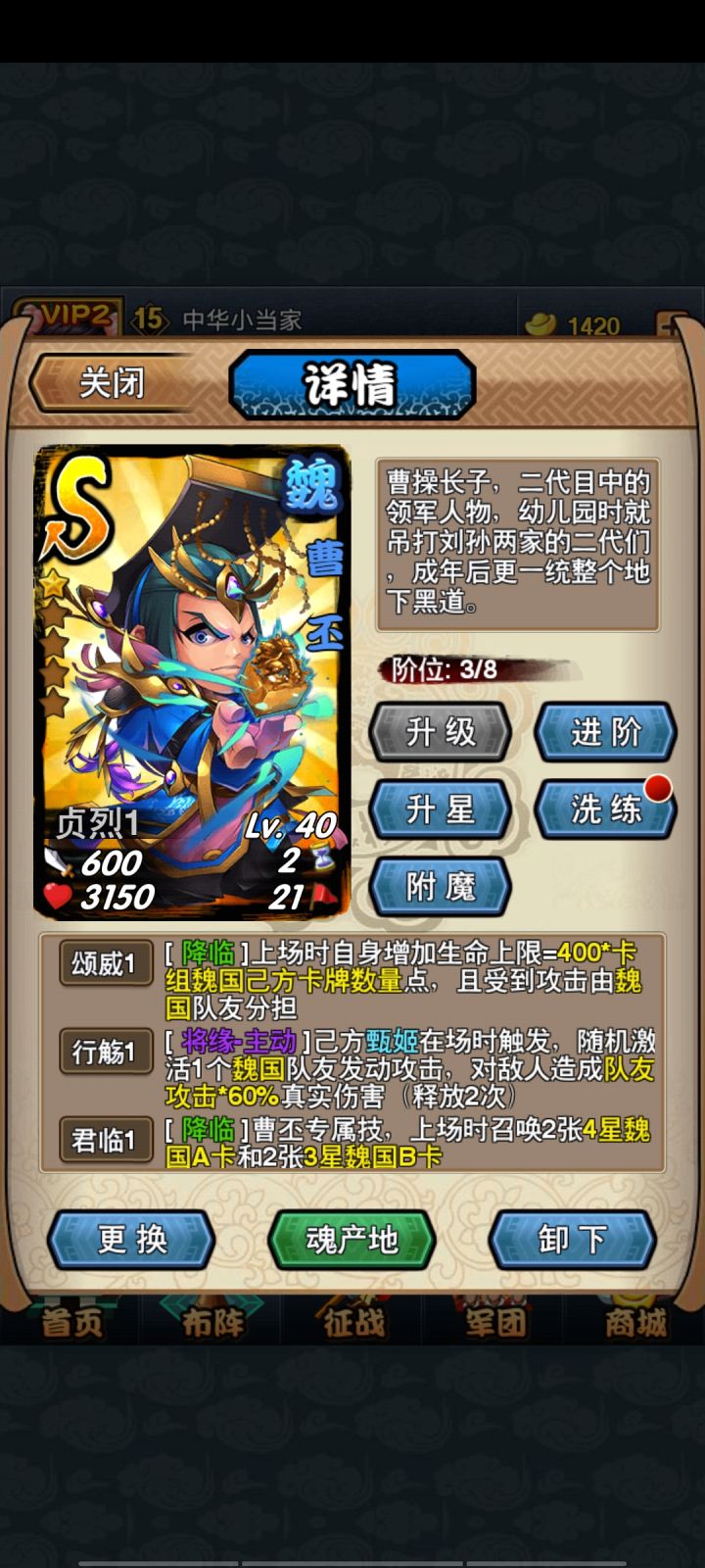 这游戏有什么玩头的,不冲钱几个月一张稀有卡,满星稀月要一年多一张还不一定能满,幻境4500元宝进宝库,600元宝转一次,稀有卡全几个碎片,吕布只有3个碎片,合成一个要30碎片,每一次还不一定一样将的碎片,一天一百元宝获得,一个星期最多1500元宝,本人冲了500多,实在玩不下去了,天天卡同一关,能卡你几个月,天坑一样的游戏。
