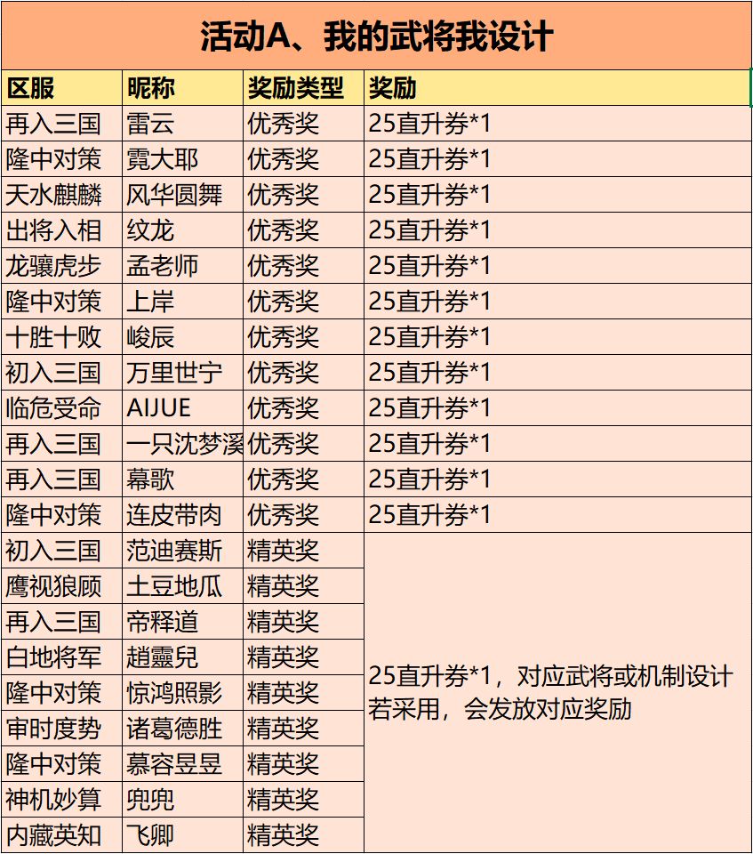 🎁活动A、我用心招募过的武将(达成必100%得招将礼包) 第1期(11月1日-11月11日)开奖啦,恭喜以下主公获奖! 【奖励领取时间】11月11日-11月13日(72小时内有效) 奖品已发至获奖主公的游戏邮箱,请主公们及时进入游戏邮件处领取奖励。 #敲黑板# 1、🎁活动A、我用心招募过的武将有效期至12月31日,达成必100%得招将礼包,每2周统计一次并在进行奖励名单公布同时发奖; 2、🎁活动B