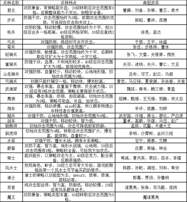 前言: 感谢游戏玩家死亡呼吸提供的攻略一、 武将分类 在武将系统里,有君主,步兵、枪兵、弓兵、弩兵、轻骑兵、重骑兵、山岳骑兵、弓骑兵、武道家、舞娘、炮车、贼兵、战车、驯熊师、驯虎师、水军、都督、策士、风水士、道士、贤者、魔王。 二、武将选择 任何网络游戏,按基础分,都可以大致分成这几类,肉。物理输出,法爷,奶妈,这游戏中多出的,魔将,舞娘,君主类,面对这么多武将,和职业,作为小白到底该怎么选择呢!