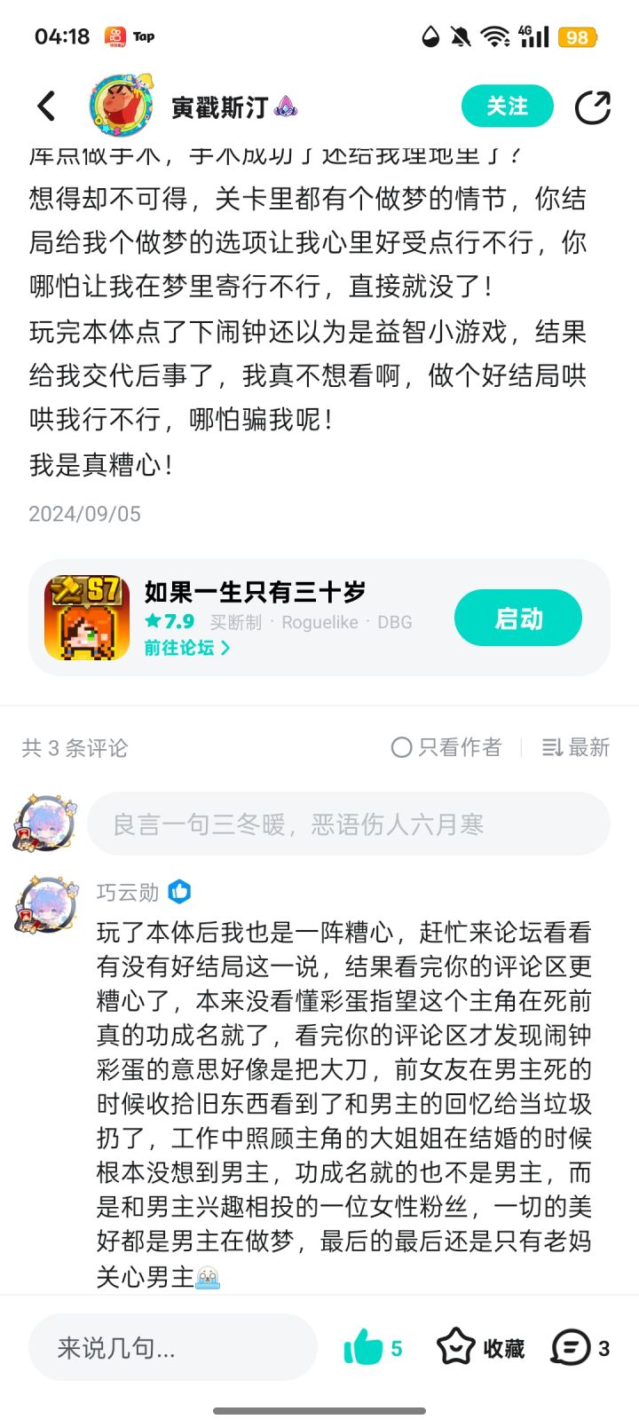 : 插眼待玩,看了你的评论,我觉得这个游戏更像是作者想要表达哲学思想的一个载体,不能以看待游戏的眼光去看。我更想知道,游戏作者和文字作品的作者是不是一个人,作者的身体健康方面可好?别真的有什么病,还没玩明白他噶了,那就真的玩不明白了。想深挖背后的创作故事。
