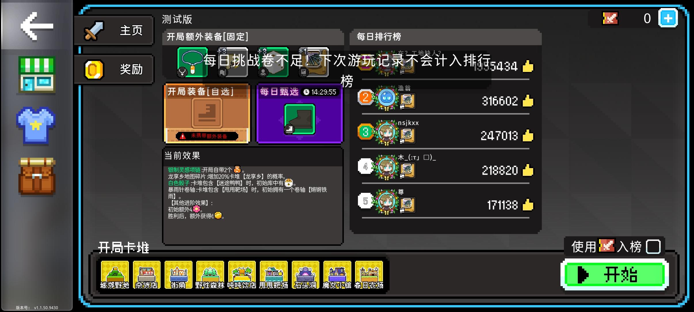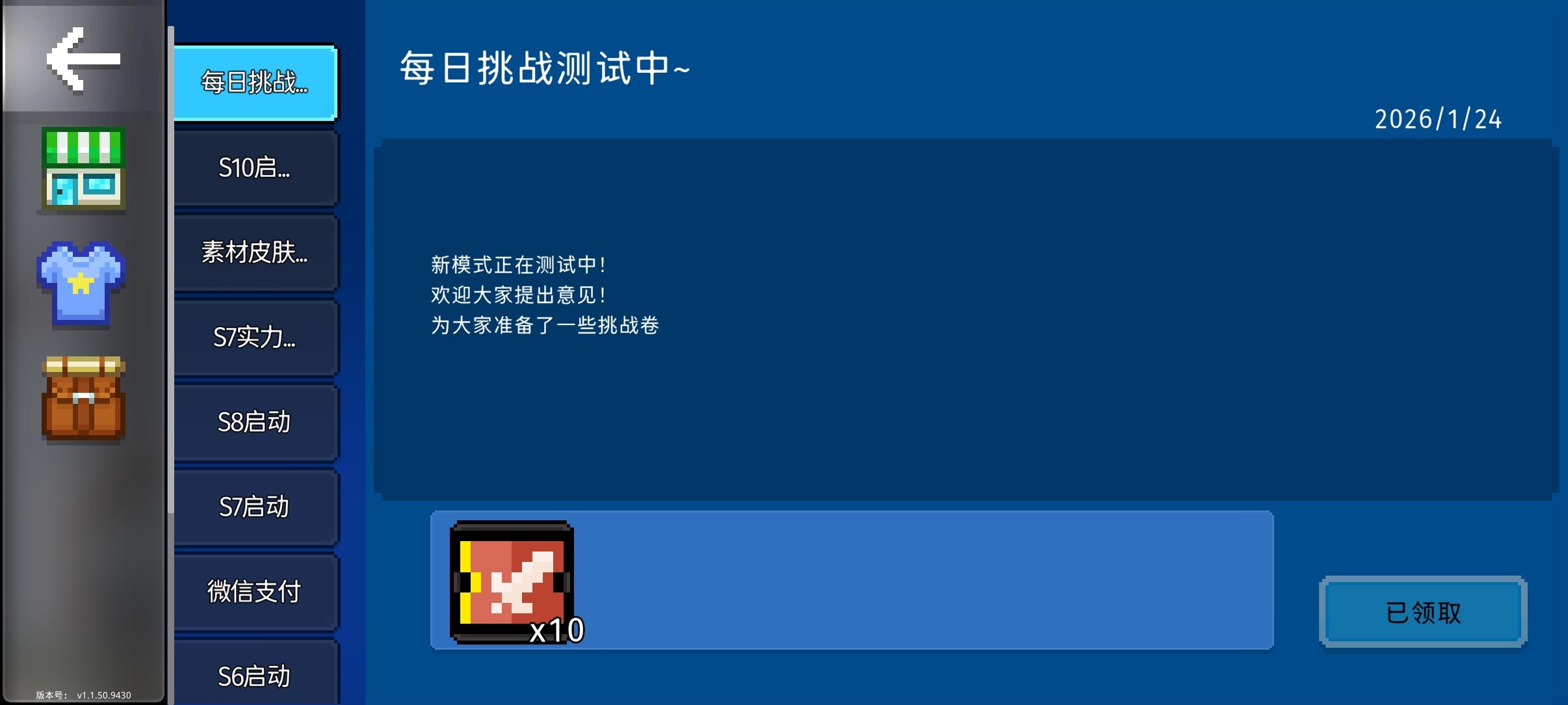 每日挑战!本周上线了测试版的每日挑战供大家游玩。新的每日挑战会全服统一一个关卡,允许玩家自己携带一个装备,试试自己能冲到第几名吧!每日商店!除此之外我们还开启了新的每日商店系统,每个玩家每天都能抽到自己专属的折扣装备。但是优惠仅限本日,过时不候哦!每日奖励!当然,为了配合新的玩法我们也添加了更多的奖励!每天完成每日挑战后可以获得额外的金币,这些金币是不计入每周金币上限的哦~还有更