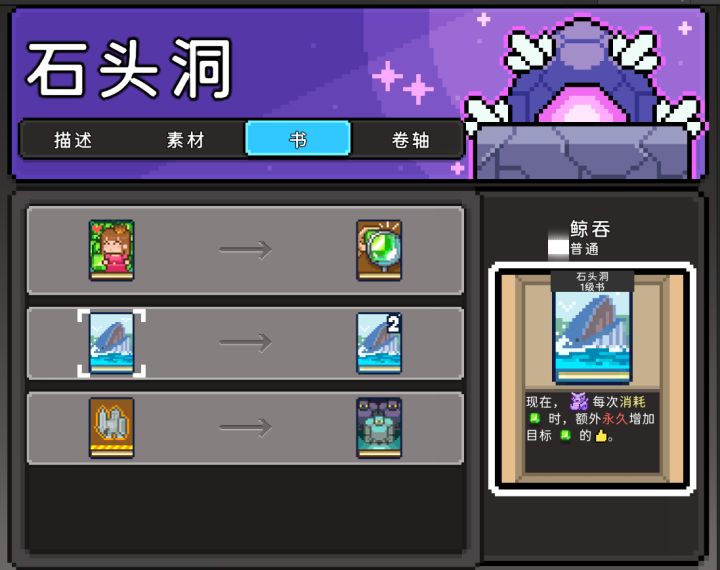 如果有任何建议和问题,欢迎加Q群,群号:549180217来吐槽我也是可以的。装备池更改定轨每个池子的目标装备,会随着【歪】而概率逐渐上升。【歪】2次,下次就会100%必出。中了之后,会重置计数。进阶数值展示现在可以点击装备的进阶tab浏览进阶属性。书店锁书现在,游戏中进入书店,可以锁定【书籍】,在刷新和下次进入书店的时候,依然会存在。通关记录通过记录中加入装备与其他信息的