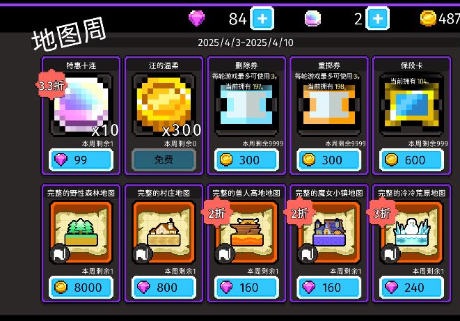 周商店上线了大概在更新第8周的时候,当时就有周商店。不过那个时候就是些皮肤而已,金币购买的。现在我又把这玩意儿上架啦!大概生命也是这样无意义的轮回吧(碎碎念…周商店设计指南:1.每周一个巨便宜的十连;2.白给的一抽金币;3.特色本周直购商品;(大概装备或者皮肤,按照品类进行循环吧…)更新了一个装备池特色鲜明的袜子。去掉【城郊野地】可能前期会吃苦,但是风险和收益同在!新的机制加