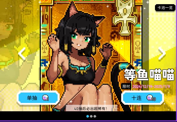 如果有任何建议和问题,欢迎加Q群,群号:549180217新池子有谁能拒绝可爱的猫神吗?数值调整1. 略微削弱了【尾尾小窝】;2. 略微加强了【多鱼湖】;细节调整1. 给部分没有声音的按钮加上了声音;2. 给不明显的左右按钮加入缓动动画;3. 解决了【每年第一回合可以SL】的问题;4. 修复皮肤礼包不能获得金币的问题;5. 修复上周部分玩家昵称为【未知】的问题;就酱~下