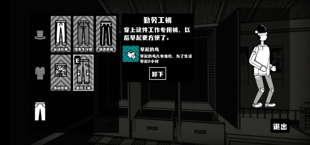 所有服装效果可参考以下图鉴 该作服装可以提供各种不同的增益效果 主要分为三大类,同类服装只能装备一件不可叠加 帽子类服装(《走后门》主要用于减少各种npc的消耗增加收益) 衣服类服装(《工作服》主要用于降低各种打工小游戏难度增加打工效率) 裤子类服装(《兴奋剂》主要用于玩家自身的各种增益效果) 游戏初始只有2个服装格子(只能装备两件服装)可以在商城内氪金解锁第三个服装格子+运动长裤(增加移速) 总