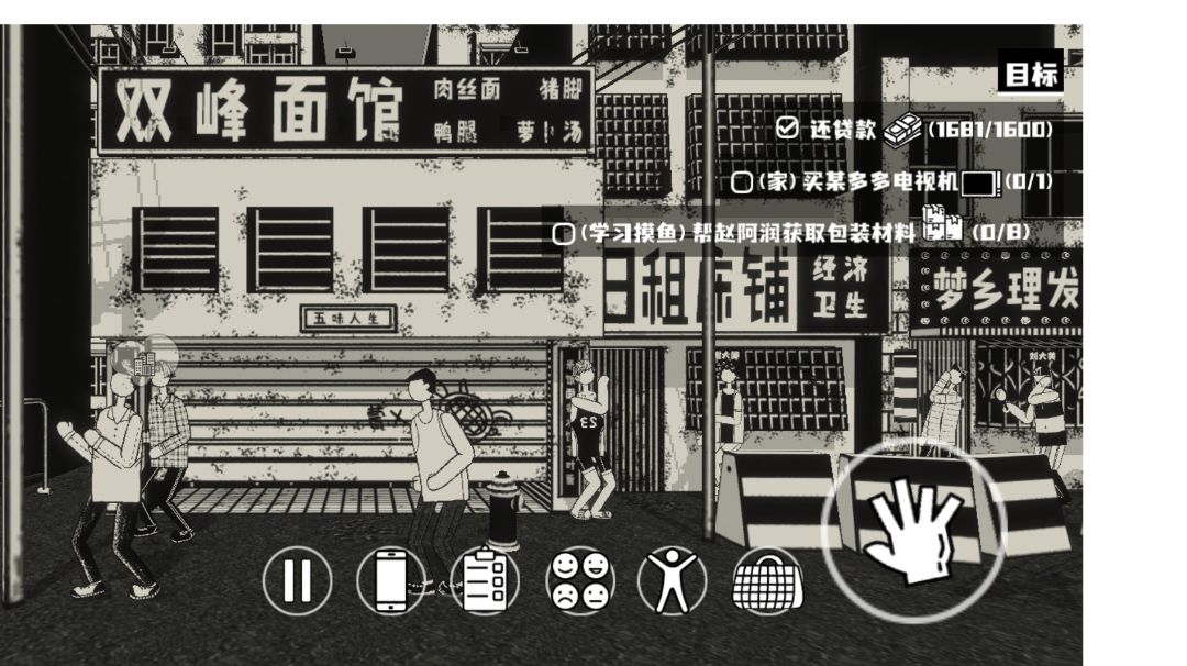 咳咳,那什么,多少算是玩的有点明白了,尤其更新大幅下降难度之后……就姑且先做一个个人的理解吧,也希望能够帮到大家。 首先,关于打工,分两种,一种是在人力公司接取的,分别是伐木、搬箱子、分拣和数坤,搬箱子和伐木前两者较为简单就不多说了。先说分拣,电视、音响、热水壶、电饭煲、风扇、游戏机、微波炉、音响这几种,根据屏幕下方给出的图标,把流水线上的相应电器放到右下角两条流水线上面。数坤这里分别是坤、鸭、鹅三种,然后根据它们外貌特征分为增产(多腿多翅)、鬼步(太空步)、停留(中间停顿)每一次这些家禽走过去之后提出有几只什么类型什么品种的,反正不太建议接数坤的任务,耗时耗力还不太能讨好。然后这几种任务根据耗费时间、心情和获得的金钱、材料数量分别为简单、一般、资深。建议接资深任务,给的金钱和资源更多(当然难度也更高) 另一种则是积累的点赞到达一定程度可以在相应的NPC处接取任务,完成任务后永久解锁相应工作。目前已知的有,在罗纳XX处拿到车钥匙,去主干道左侧电车完成任务解锁外卖;在烧烤摊买十串肉交还摊主解锁烧烤;在公园赵四润处给予一些特定材料解锁钓鱼;在西餐厅一楼npc处缴纳一百元押金解锁服务员;在街头艺人某浪处给予一些特定材料解锁街头卖艺等(后续待探索)这类任务消耗的时间较少(2-3h),心情之前也算少但是更新之后并未进行调整,所以与资深难度相同为30。其中比较建议接取的是西餐厅服务员任务,没有限制时间,可以截屏慢慢找,保证成功率。全部正确之后可得200元。 再就是特定资源了,只能在人力公司发布的工作和翻找垃圾桶获得,分别为木头材料(伐木得)、建筑材料(搬货得)、有机材料(数坤得)、维修材料(分拣得)和包装材料(目前只有翻垃圾桶)。然后垃圾桶根据位置不同翻找出来各类材料的概率也不同,分别在深圳站左侧(建筑、包装)、快递柜右侧(维修、有机)、公园左侧(包装、建筑)、后街废品站右侧(有机、维修)。翻找垃圾桶扣除25心情,半个小时时间且有25%概率手受伤。特定资源可以完成相应任务获取报酬以及解锁工作。 再就是店铺都在哪儿了,主干道从左到右依次是深圳站、洗浴中心、人力公司、西餐厅、药房、百货公司、快递柜、酒店、公园。从人力公司与西餐厅中间过道和公园左出口可以到达后街。后街从左到右分别是废品回收、网吧、彩票站、小饭馆、日租屋、理发店、炸鸡摊、红薯摊、烧烤摊。 小饭馆的鸡腿饭性价比最高,36元66饥饿值和5点心情还有21%概率获得太美味了一小时回血buff,然后平时睡觉建议去公园长椅,五分之一的概率失眠掉血,白嫖一晚上睡眠。恢复心情的话建议公园撸猫、然后是完成心情各项任务,除了睡酒店和吃西餐(不包括汉堡)之外都建议完成一下,性价比很高的。然后恢复健康建议去西餐厅吃汉堡,78元66饥饿值和10点心情还有60%概率获得一小时回血buff。npc发布的任务除了百货公司一楼右侧卖任务物品的吴戴维借钱任务之外都可以接,稳赚不赔的。吴戴维借五百块钱,获得10个鸡腿(46饥饿值、6心情有概率腹泻),周三之前可以考虑借一下,周三之后的话就等到下周吧。 如果健康值和心情都特别低就去洗浴中心蒸桑拿,回血回心情还不限次数,建议吃饱了过去。嗯,以上。