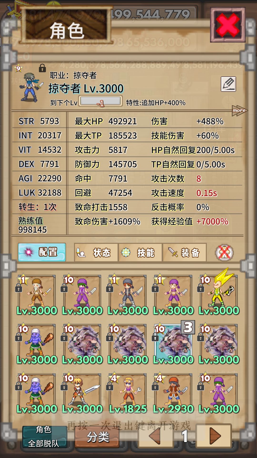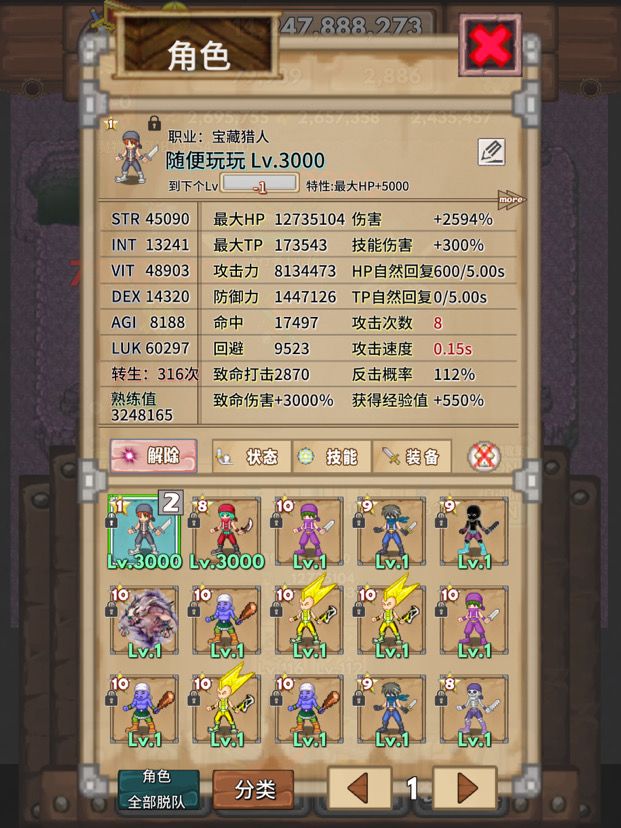 全角色满级满转生图鉴,弄起来好麻烦,目前就练到满级,转生点没弄,感觉没什么意思,主要不怎么想弄,那天弄好了就发,其实对这游戏有点无语,一个挂机游戏没有离线收益,好装备获取难度太高了,开修改器都没什么用,量并不能解决值的问题,前作其实就是装备获取难度太低了,导致基本不会卡关的情况,愣是说那个好玩,其实这种挂机游戏吧,都差不多。
