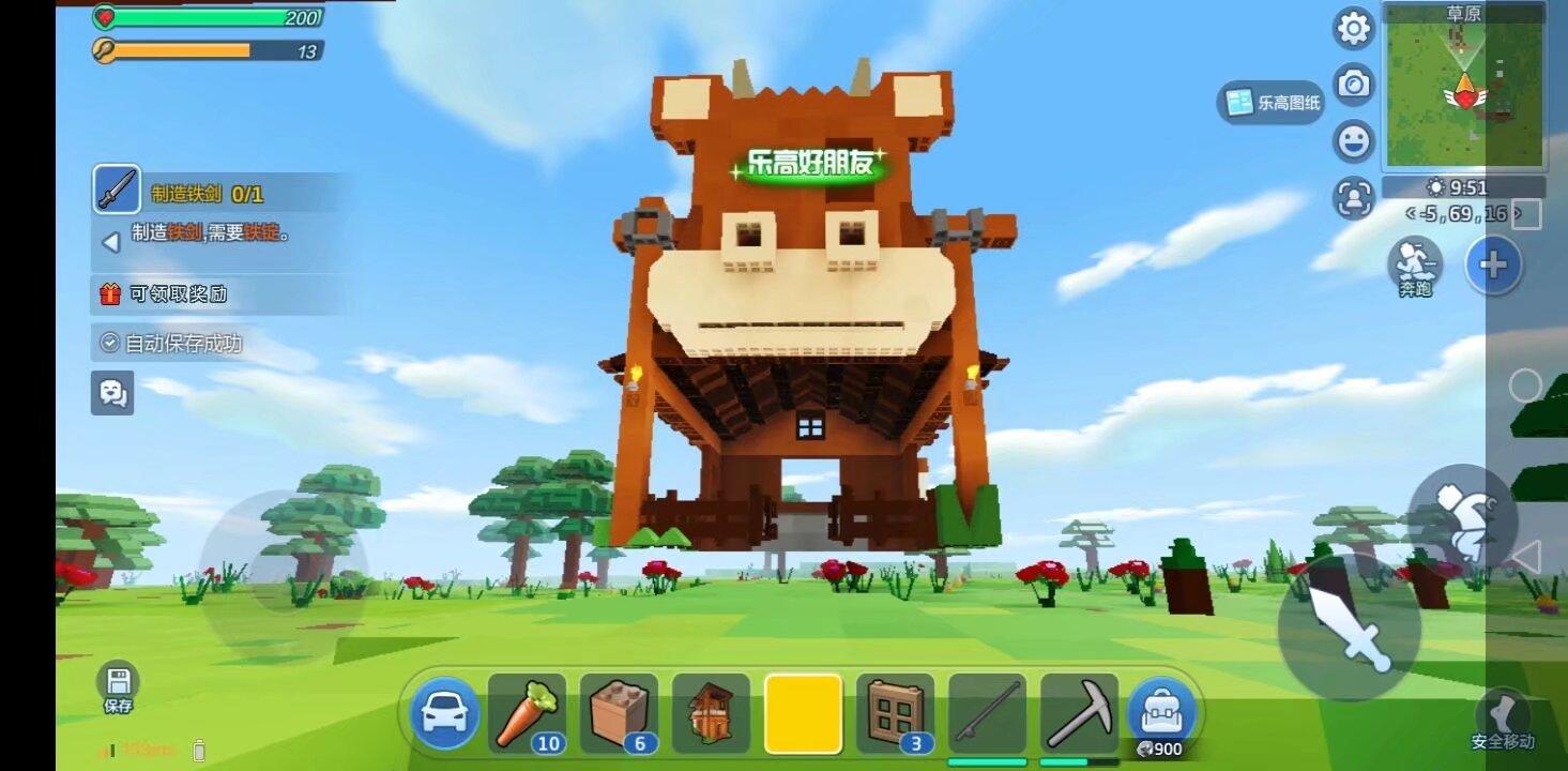 二、玩法:在玩法方面和大部分沙盒类游戏方式差不多,但是却不输于很多类型的。毕竟在2019年的时候谁又会做一个新手任务,让玩家去做,然后获得物资呢。据我所知,大部分沙盒在当年并没有这个功能,都是让玩家自己一点点去探索的,所以仅靠这一点就赢了很多了。它还有一个类似小镇的功能,能让玩家在里面尽情建造(虽然只是几个大建筑摆来摆去,再加一些另外的建造),但是它能邀请其他好友进入做客属实是让人惊讶了吧,而且建筑还能通过签到获得,所以玩法还是多种多样的。再加上乐高动画里面的科技基本都有,还有蓝图能生成房子,这些只有在“某某盒子”里面能做到了吧,所以真的很超前了。虽然它这一款游戏也是与方块互动并制作物品,再用来发展,还有打怪系统,但是这本来就是积木的世界啊。乐高作为最好的几个积木品牌之一,确确实实是建造类的,所以出一个手下的游戏不过分吧。