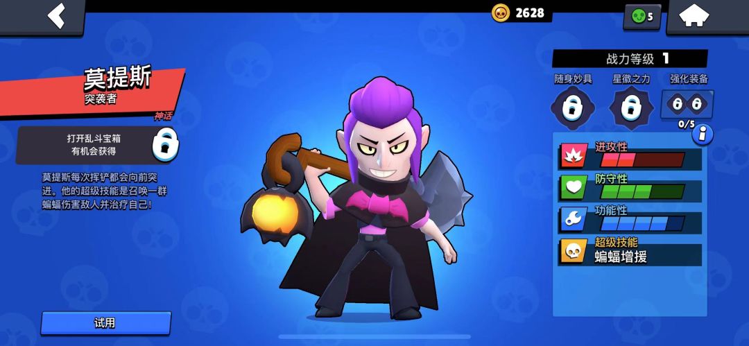 本文首发【荒野攻略组】公众号,未经授权禁止“抄袭文章”转载至其它平台 hello,各位荒野乱斗的斗士们大家下午好呀!我是你们的小编DD,今天小编想给大家带来的内容是关于英雄莫提斯的玩法攻略,有斗士们在后台踢小编说想看这个英雄的讲解!今天小编就来给斗士们全方面讲解一下~感兴趣的斗士们赶紧跟着小编一起往下看看吧! 角色特点 莫提斯是刺客型角色,普攻是突进一段距离,并对目标造成伤害。大招是召唤蝙蝠对附近