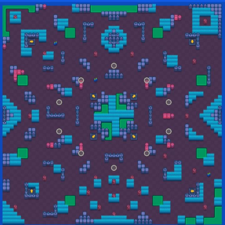 【正常图➊】【特点:】没有一个箱子、有陨石,一定程度上左右对称。中间十字型草丛,围墙卡出四个出口。四个角有向外的跳板,四周小块草丛跟墙体,随着陨石不断摧毁草丛跟墙体,对射手的有利程度会越来越大。【打法:】因为没有宝箱,单纯靠自己的作战实力。可以选择刚也可以选择苟。杀人多的能量也就多,后期肯定会有优势,但是能量多也容易被集火针对。陨石会砸人多的地方,所以尽量跟别的英雄拉开距离,建议保守一些。
