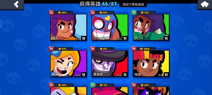 如图所示,目前凑了8只11级虽然不是我娱乐常玩的,但星光联赛爱用宝石我用波克,格斯,潘妮/柯莱特赏金我用黑鸦,格斯,里昂/潘妮金库我用潘妮,邦尼,柯莱特淘汰我用佩佩,格斯,黑鸦热区我用波克,潘妮,黑鸦足球我不踢,我直接大退自我驱逐11级的目标只是打星光联赛不被看扁所以推荐我一个排位补盲的叭呜呜呜让我在不熟悉的图有个选的强势英雄不擅长近战,但可能我就缺个近战补盲下限低点,操作