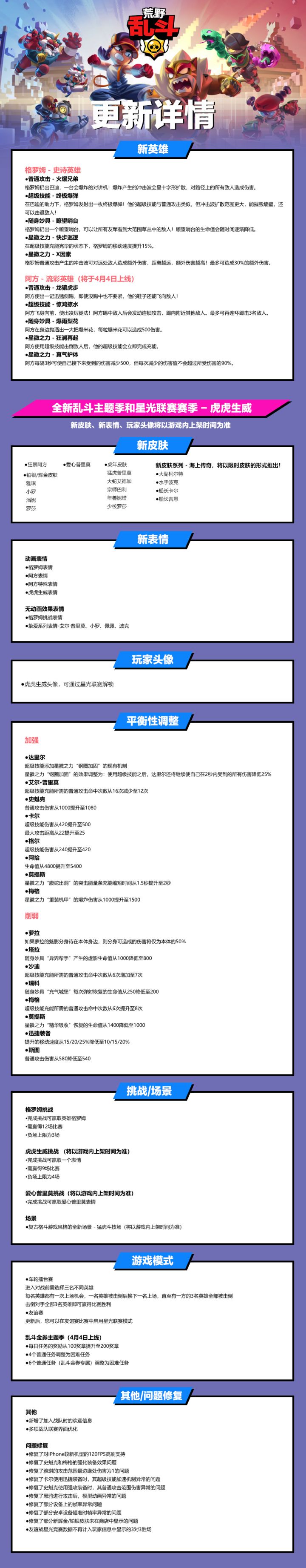 斗士们:游戏将于3月23日15:00开始维护,预计时间3小时。维护结束后您需要更新至最新版方可进入游戏,新版本将包括以下内容:一、 全新英雄挑战:完成限时挑战后您将解锁全新史诗英雄格罗姆二、 3月28日前登录游戏限时领取免费超级宝箱*1三、 全新玩法模式:车轮擂台赛 四、 全新乱斗主题季:虎虎生威 (将于4月4日上线)更多信息请见下方更新详情感谢您的理解与耐心等待。