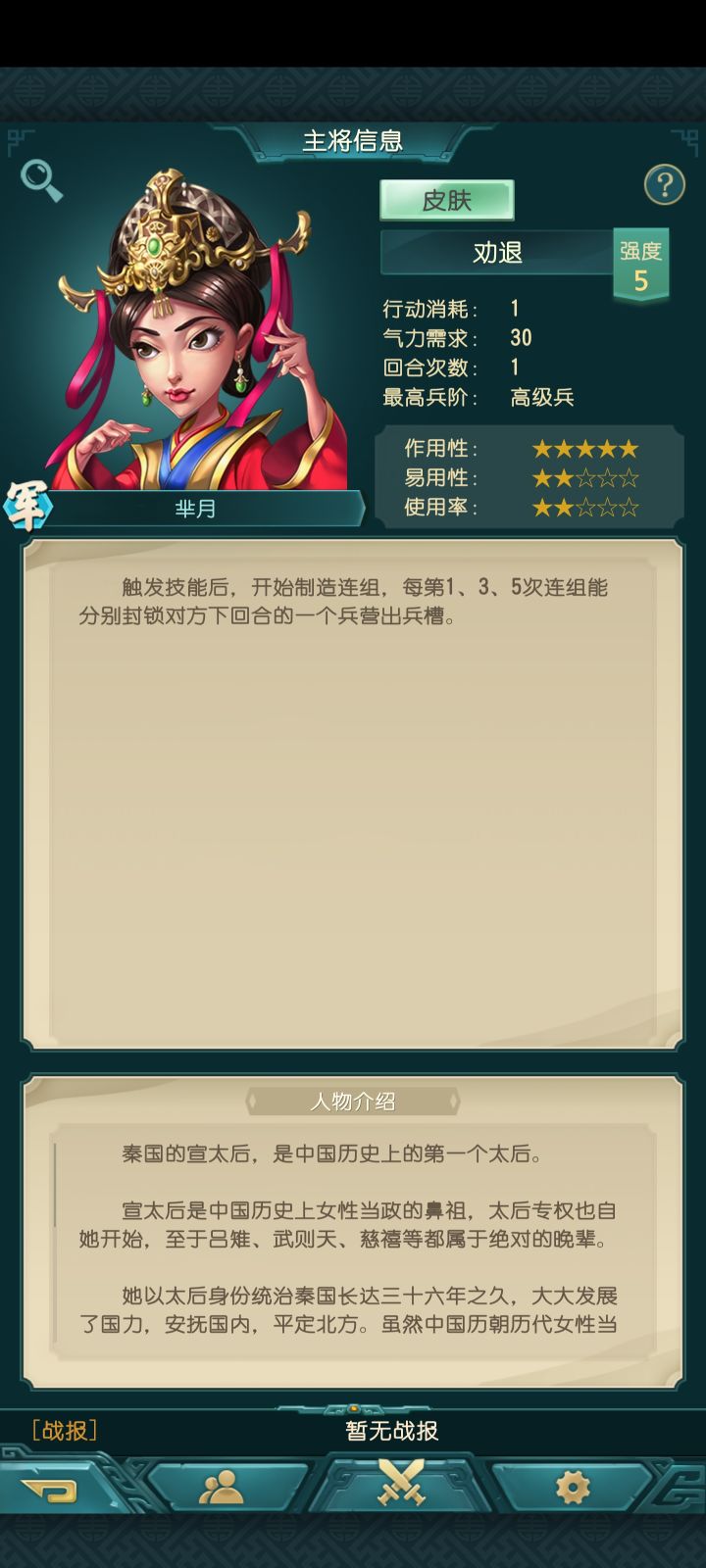 芈月是一个可以免费获得的5强主将,是新入坑小伙伴体验这个游戏很好的选择。进去游戏后务必先把开场引导任务做完,正式进入游戏主界面之后,按照任务引导提示一步步完成。国家阵营可以随便选,影响不大的。完成任务主要是通过在演武场打匹配,任务引导会帮助你了解一些基本的游戏机制。演武场获胜可以做任务解锁兵种。演武场里面点开始竞技会随机匹配同一时间也在搜索对手的玩家,当前没有玩家的时候就会匹配人坤,就获得胜场