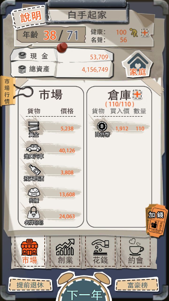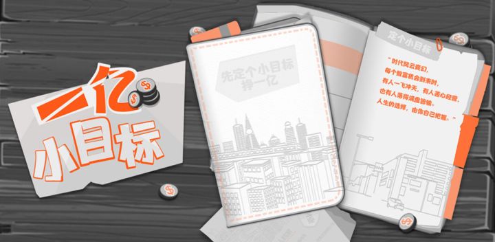 各位老板好~小目标一开始是一个尝试的项目,希望能把现代人一生发家致富的过程抽象出来。近几十年的经济发展,如洪流般影响了我们的生活。奋斗与机遇,财富面前的人生选择,大起大落,既是企业兴衰史,也是个人奋斗史。一亿小目标为休闲娱乐手游。20岁进入社会闯荡,在退休之前能否实现赚到【一个亿的小目标】?市场倒卖【比特币】、【山寨手机】、【黄金】、【进口轿车】、【飞天白酒】、【瓜子】、【网站域名】、【