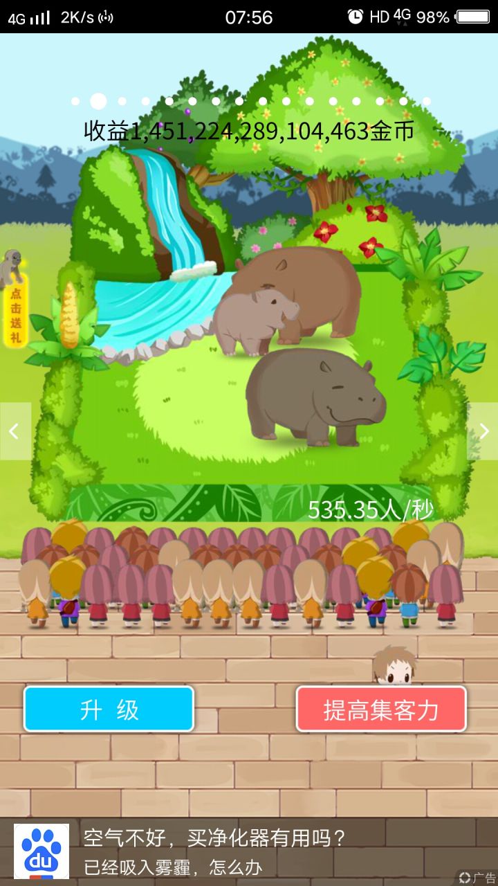 河马的集客力升级到四十级,集客力才0.45人/秒,犀牛集客力二十三级,集客力已经2.84人/秒了