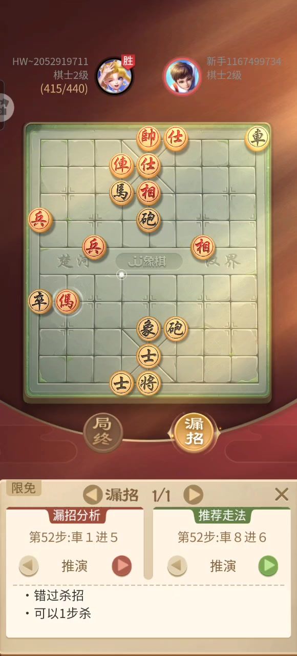终棋是对面没有落相下去我炮下底绝杀了,但是我看这个系统的漏杀走法感觉有点离谱,落相的时候我军本来就对着的可以吃,为什么不吃呢?#