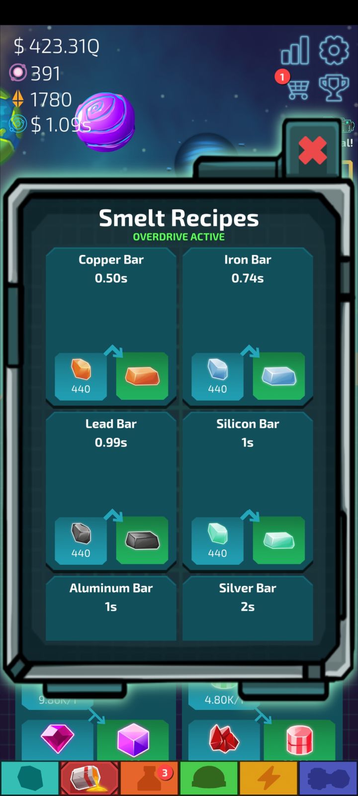1,一开始就要疯狂转生。不管肝不肝都要做到满10M立即转生。把离线收益时间从最初的2小时升到8小时,就可以睡个囫囵觉了2,离线的采矿速度是20%,smelt和craft速度不变。睡觉前准备好足够多的原材料做一些中间产品,比如硅~玻璃。千万不能一个工人做玻璃一个做lense一个做laser,保证旷工3,随着星球不断开采,小飞机的速度会越来越慢,大约从面板速度的5倍逐渐减少到75%,需要不定期升级