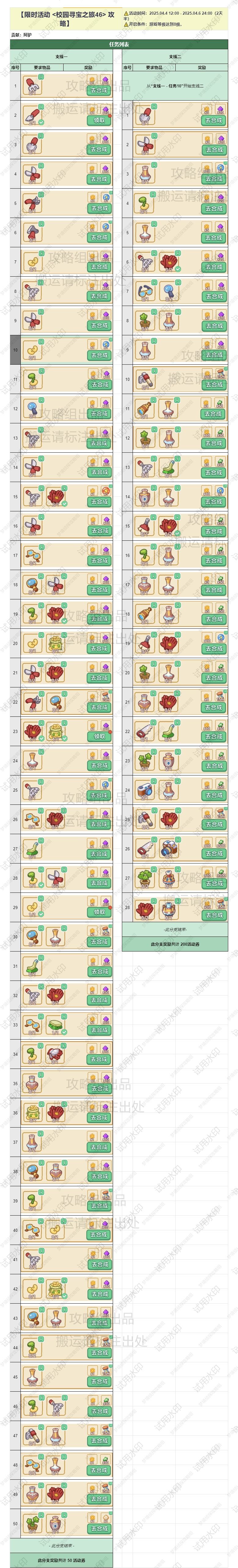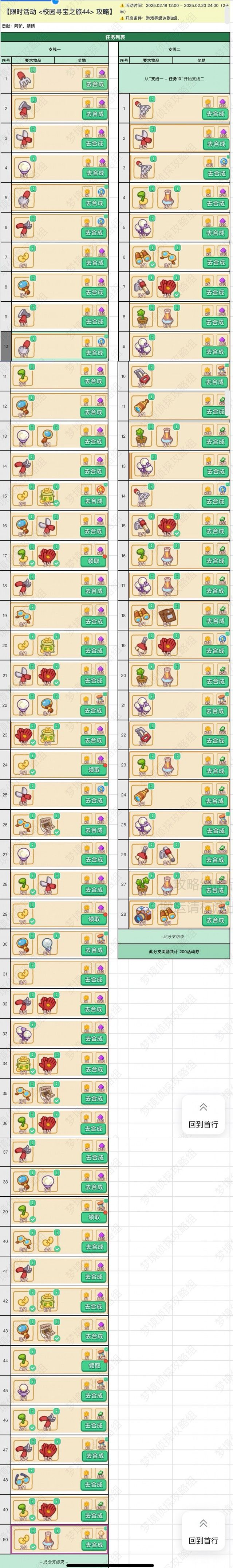记录了一下校园寻宝之旅的任务顺序,供大家参考 主: 1. 工具2(叉子) 2. 工具5(剪刀) 3. 工具6(花园剪) 4. 灯泡3(中型灯泡) 5. 工具3(小铲子) 6. 工具6(花园剪) 7. 种子袋4(大袋种子) 8. 观察工具3(放大镜) 9. 工具6(花园剪) 10. 盆栽1(种子),工具3(小铲子) 11. 工具6(花园剪) 12. 工具7(扫叶耙) 13. 工具9(扫帚) 14.