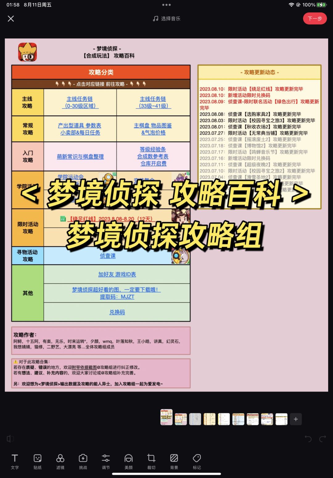 🧡梦境侦探 合成玩法 攻略百科🧡 攻略指路如下~ 🌟攻略来源🌟 【梦境侦探攻略组】(一个隐藏在官方群里的民间组织) 🌟攻略地址🌟 梦境侦探 各官方企鹅群的【群在线文档】里。(路径见p2) 群在线文档包含⬇️: 1、【梦境侦探】百科全书: 所有合成玩法的常规攻略,以及其他副攻略的链接指引。 p3: 攻略首页 p4: 主棋盘道具全攻略截图 p5: 主线任务链攻略局部截图 p6: 物品全图鉴及气