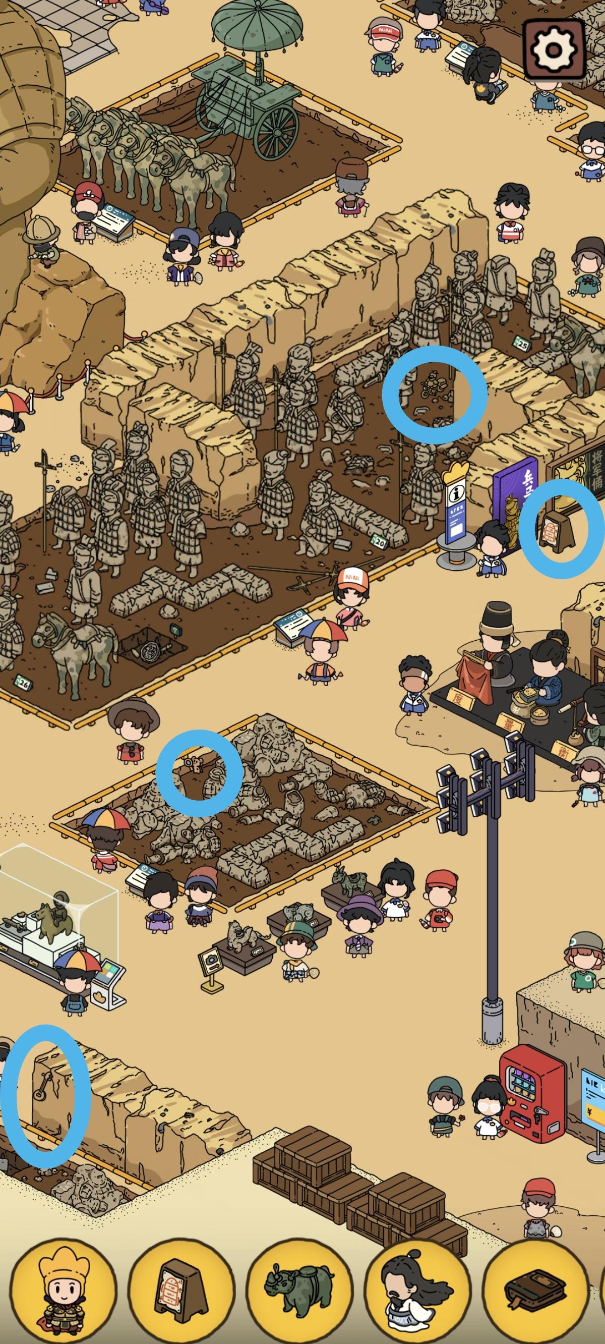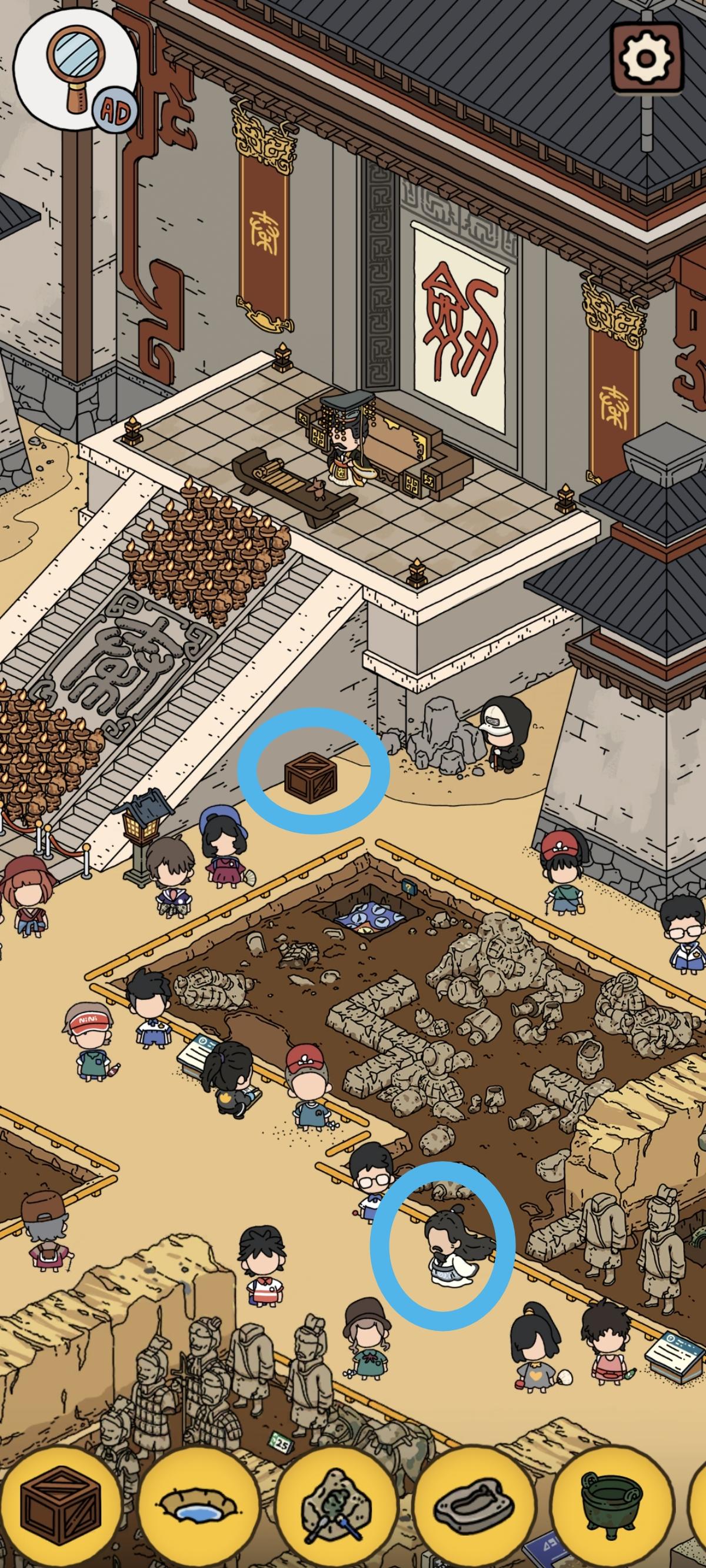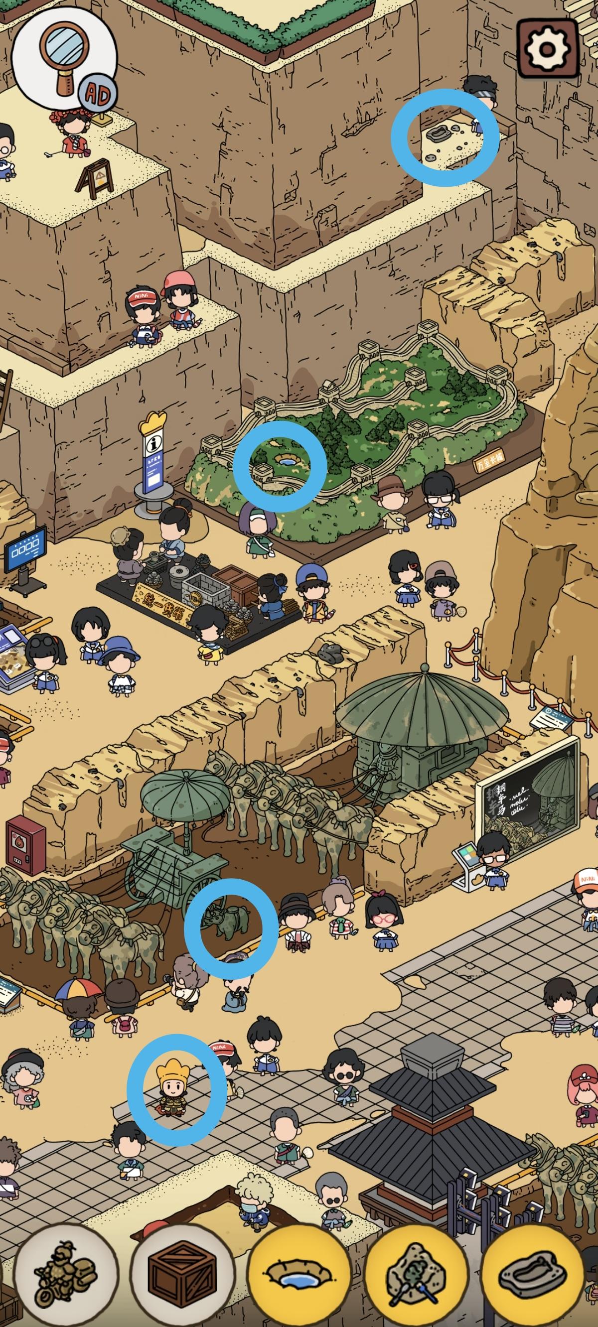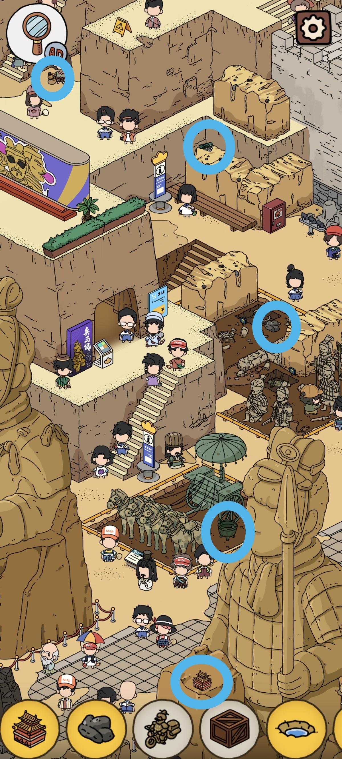 p1:巨人的脚印 积水坑 青铜犀牛 妮妮p2:文物清灰 本子 竹简 地面金光 p3:摩托兵马俑 禁止触摸 鼠鼠 古代乐器p4:储物柜未关p5:木箱 古人p6:葫芦水壶 捆绳 妮妮的帽子 青铜鼎 榫卯结构