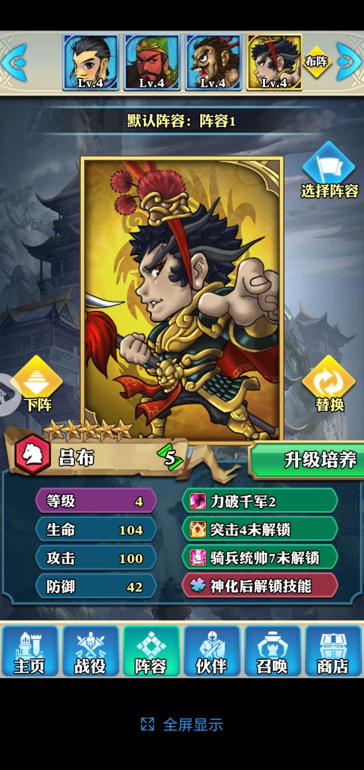 亲爱的主公,本次《神将录》版本更新后全面优化了UI界面,同时加入了新的功能,故此做了这个介绍,希望对大家能有帮助。1、主菜单栏 —— 显示在界面最下方,在任何界面都会显示主菜单栏,便于玩家随时操作。主页:在任何界面点击“主页”按钮,就会直接跳转回游戏主界面画面(家里)召唤:点击“召唤”按钮就可以召唤你所中意武将为你而战!阵容:可以对上场阵容进行更换配置伙伴:可以对你属下的武将进行升级、