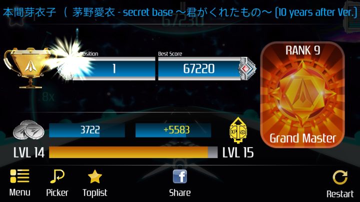首先我们来讲一下游戏的基本结构。 第一个是你的等级,第二个是任务,会不定时出现,第三个是游戏币,这三个都要有网络的时候才会出现,还有的就是没网时不会加经验和游戏币,你所玩出来的分数不会出现在排行榜上。第四个就是游戏官网吧。这里可以看看视频,还有帖子。(如果你看得懂的话(╯' - ')╯︵ ┻━┻ )这第一个是个人排行榜,第二个是最热门的前一百首歌排行榜(注:在每一首歌的最右边的颜色表示难度,