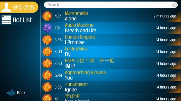 ①开始游戏 ②排行榜 ③一个国外的专门分享游戏视频的网站 (你开启录像的话就可以分享到这里面)④设置 ⑤商店 ⑥钻石和游戏币 ⑦经验条①游戏内自带的音乐②本地音乐③按歌手分类④最近使用的音乐①歌曲详情②录像开关(开启后每次玩自动录像)③排行榜①分数倍率(最高8倍,碰到白方块会降)②当前得分和歌曲(赛道)进度③能量条(用于飞船技能,出现红色表示进入冷却)④当前获得的游戏评价(