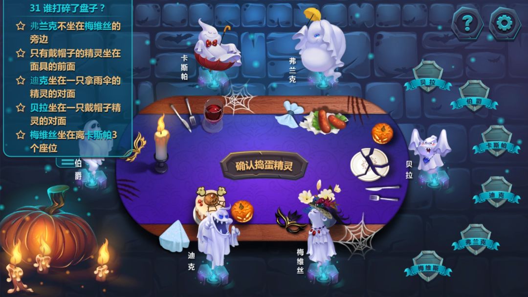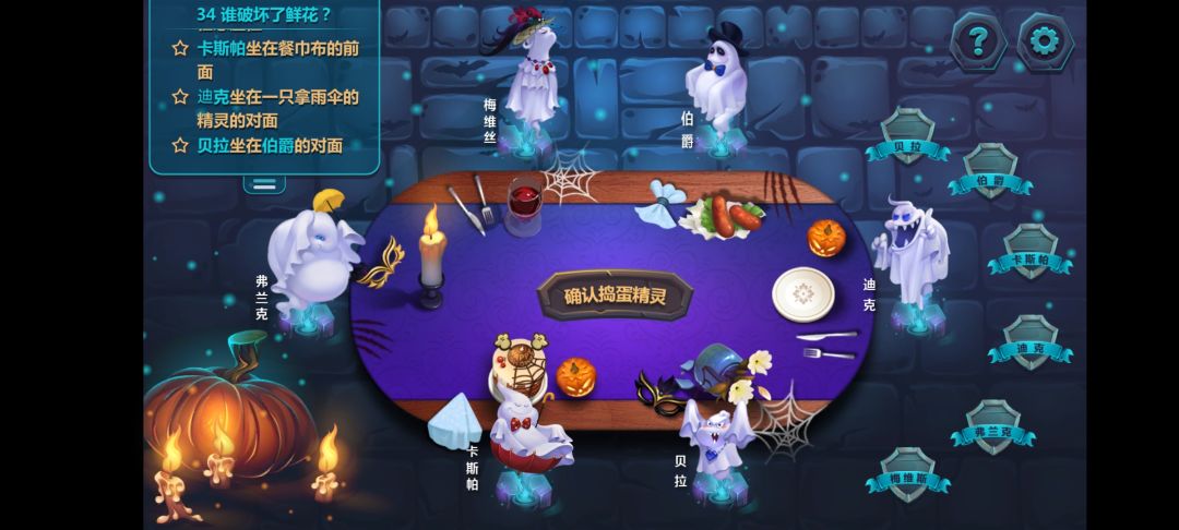 34关的位置,每一条都能对上,为什么失败了? 梅维斯在雨伞和领结中间[弗兰克 伯爵] 一只尖牙在盘子前面[迪克] 弗兰克在盘子任意两侧[蛋糕盘子左手边] 卡帕斯在餐巾布前面 迪克在拿雨伞的对面[弗兰克] 贝拉在伯爵对面 全都对上了怎么就不行了?我不李姐