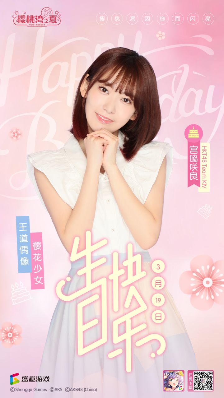 又到一年春暖花开的时节,樱花也将盛开。今天3月19日,我们也迎来了宫脇咲良的生日,粉丝们也通过各种平台向自己心目中的偶像献上了生日的祝福。AKB48正版授权偶像经营互动手游《樱桃湾之夏》也开放了宫脇咲良生日活动,共同预祝小樱花生日快乐!宫脇咲良 (Miyawaki Sakura)小档案:所属队伍:HKT48生日:1998年3月19日星座:双鱼座家乡:日本国鹿儿岛梦想:女演员喜欢的中华