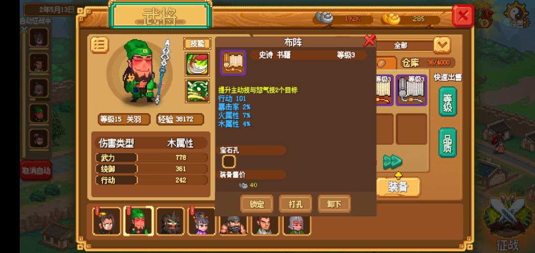 首先,贴阵容 关羽加关平加甘夫人是此阵核心,关羽主攻,关平主防,夫人加血,无伤那都是小意思! 至于刘备和三弟,只能算是锦上添花! 目前打到101关,仍然是满血通关!! 首先,这个游戏我觉得,装备是最最主要的!一个英雄强不强感觉看装备强度和效果! OK,下面贴装备 关羽必要这本神书,神书一开,技能全部变成群攻,无敌! 甘夫人尽量洗到有此属性的武器,完美的搭配! 关平配挨打加进度的书和嘲讽加血的装备!