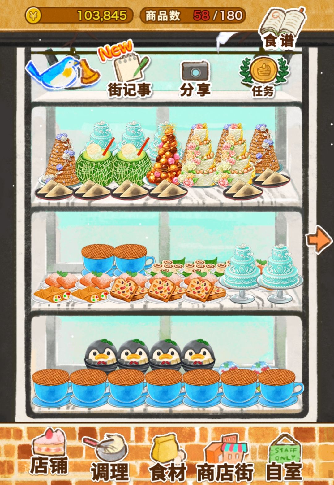 1.2我都完了5.6遍了,简单给一个攻略。有不懂的可以留言,大家也可以在这里交流经验。一半搬运一半自编,来回改了5.6遍了,可怜可怜孩子吧,随手给个赞吧。 ♥评论区欢迎补充交流 ★甜品制作不需要食谱也可以进行制作。 ☞开局小麦粉+牛油+柠檬(烤)=柠檬蛋糕(草莓蛋糕也可以) 红豆+砂糖+栗子(直接制作)=栗子羊羹 ☞前期可以做塔类的甜品快速渡过(圣诞树蛋糕也可以) ☞中期商店购买冰箱,做冷冻塔渡过