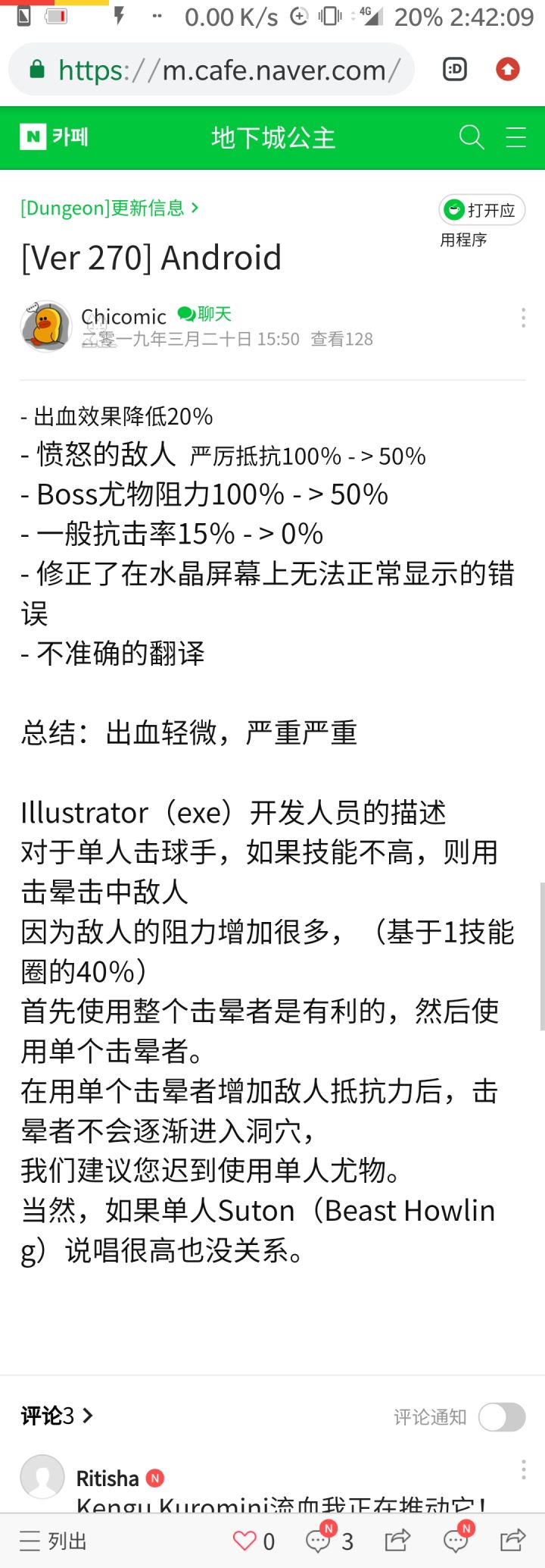 这是谷歌翻译的韩国交流群,所以会有些翻译错误。原文:- 출혈 효과 20% 감소- 분노한 적 스턴 저항력 100% -> 50%- 보스 스턴 저항력 100% -> 50%- 일반적 스턴 저항력 15% -> 0%- 크리스타 화면에 정상적으로 표시되지 않는 오류 수정- 잘못된 번역 수정요약 : 출혈 소폭 하향 , 스턴 대폭 상향그림아가(엑서) 대한 개발자의 설명1