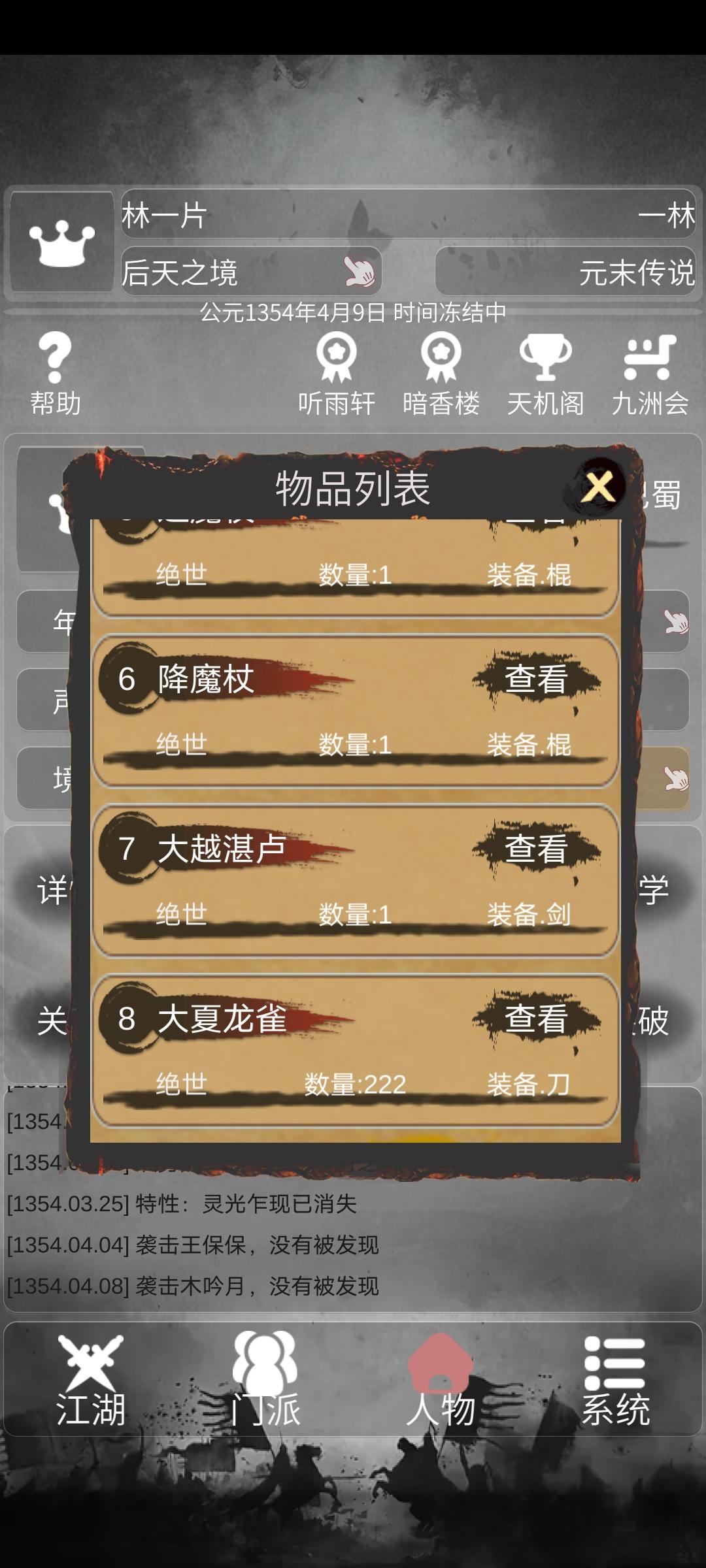 玩了三四天了,来说一下攻略,开局送你你的基本内功不是没用的,直接练到小成之后可以传授给npc加二十好感,然后教导一次加十好感,一个月三十好感度,两个月时间基本上NPC的武功只要满足要求都能学,像根骨悟性可以吃药或者奇遇增加,然后基本上就是挂机了,每次突破最好是成功率到百分之九十三,这样可以得一个天赋我也想问问作者,里面很多绝学到底在哪,长生诀合成是先天功,太虚功,混元功的混元功找不到,战神图找不