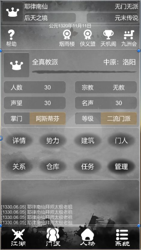 抱歉,原定于3月31号的内测无法进行,本来是打算整合现有的功能出一个简单的内测版让大家试试玩法,但是我高估了我自己,有些功能是必不可少的,又过于繁琐,连续好多天熬夜也没搞完,后面准备功能都差不多了再决定什么时候开启内测,免得影响大家的心情。这个游戏比之前的复杂太多了,能力有限,所以弄得有点慢……下面说说掌门这个游戏吧,其实现在已经不适合叫掌门了,这是一个即可以独行天下、又可以加入门派创立门派、还