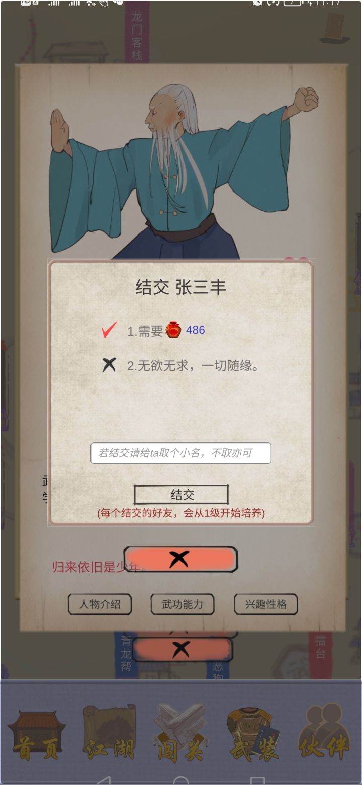 2.注意进入门派学了武功就可以判门,判邪教进正派会奖励一万铜钱,正教判正教好像会扣五万💰+三万声望