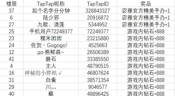 周年荣耀奖(等身宓雅)获奖玩家: 小苍 周年奇遇奖(定制手办)获奖玩家: 尼姑上香 沐小枫 曹氏盖饭 小虾米 天真 梓木香 周年探索奖(马克杯&立牌)获奖玩家: 阿汜 星辰大雪 求之 磐石 无悔终生 Guy Fawkes Kevin.Sang 手机用户9665819 Ts_ 影月 爱蜜莉雅 兀 无敌 糯米团团 手机用户82006387 浪里白条 托雷基亚 手机用户41369207 注意事项:请以上