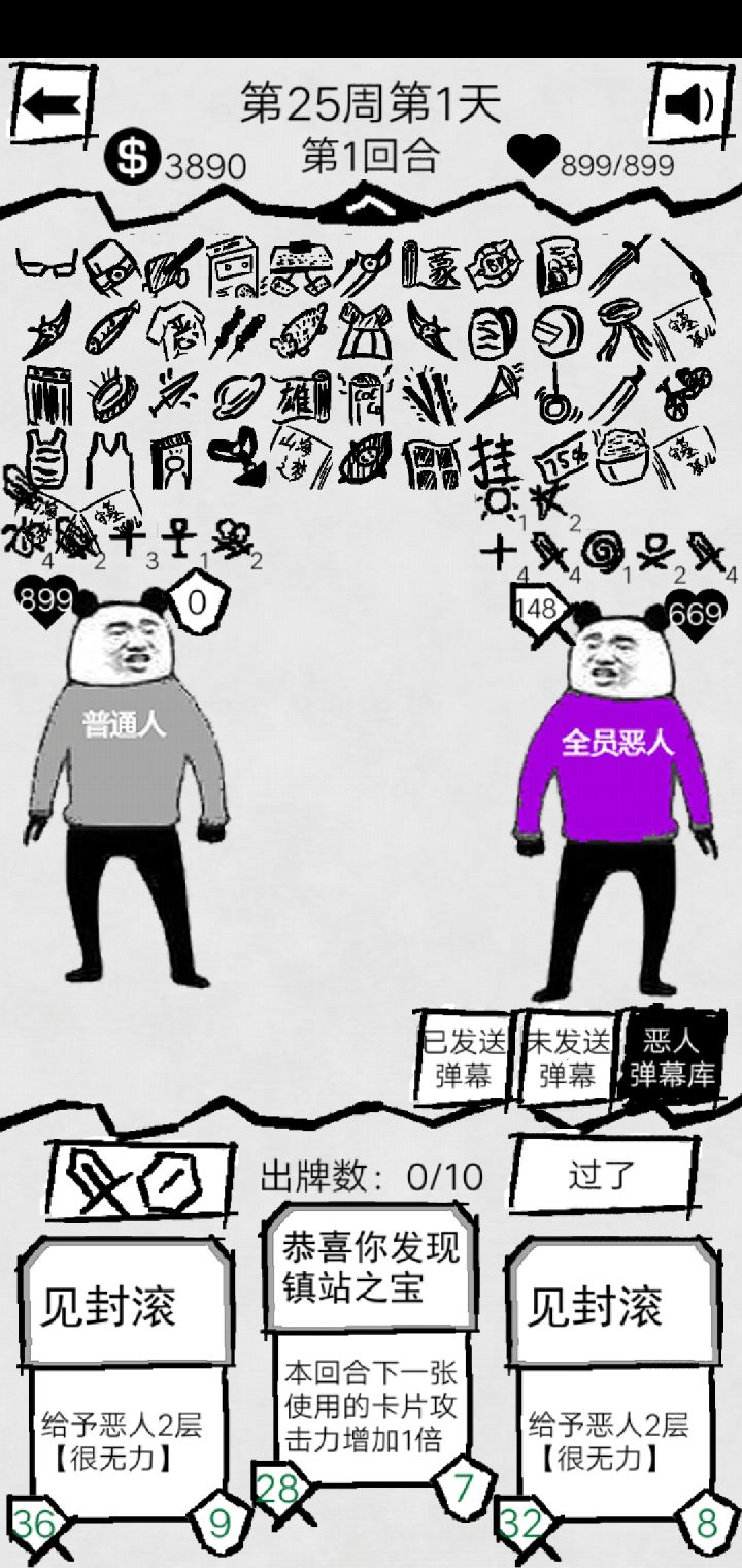 最恶心:“见封滚”流。可以让恶人所以加攻击的buff报废建议搭配:意大利炮,悠悠球,以及建议效果低的加出牌次数的装备注意事项:1.尽可能移除恶人所有塞卡的buff2.不要拿妹汁,不要拿妹汁,不要拿妹汁(到了后面随机事件和抽奖都可能得到妹汁,千万要小心)3.注意卡牌的攻击力提升,不然到了后面20回合打不死人出大问题(我那个第一是舔盒子得的,算失误吧)