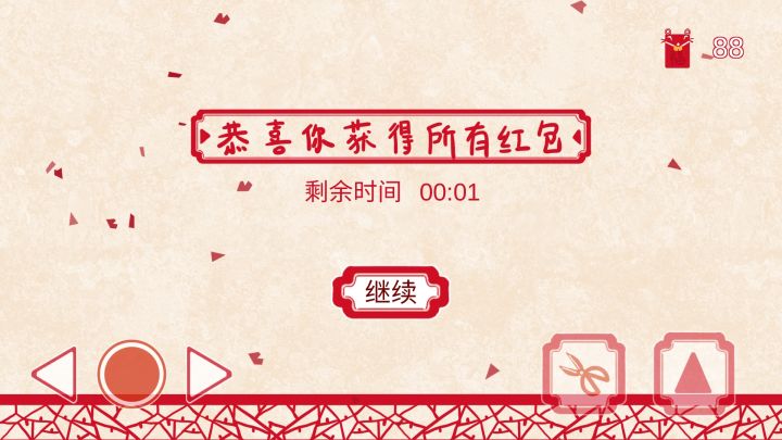虽然简单,但是很惊喜!是让人心情愉悦的游戏啊!尤其最后收红包,还有时间限制是最妙的,我拿到了87个,不知道一共有多少