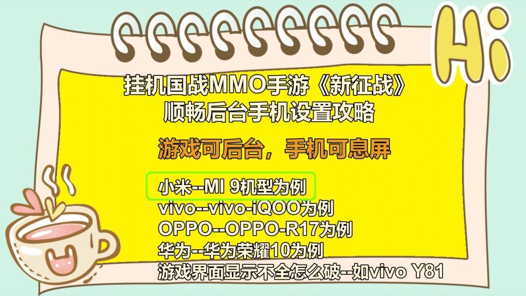 《新征战》的绝大多数任务活动都能挂机托管后台执行 手机只要不关机,自动完成自动收获经验、装备、金券、元宝券 彻底解放,完全不肝,躺平发育 你要动手做的只有激情的家族争霸个人争霸和帮战国战 《新征战》挂机托管功能如此强大,游戏在手机后台运行稳定至关重要 视频以小米-MI 9机型为例,2分钟视频为大家讲解小米手机设置。 1 手机“设置“-省电与电池-省电项下关闭“省电模式”和“超级省电” 2 “省电与