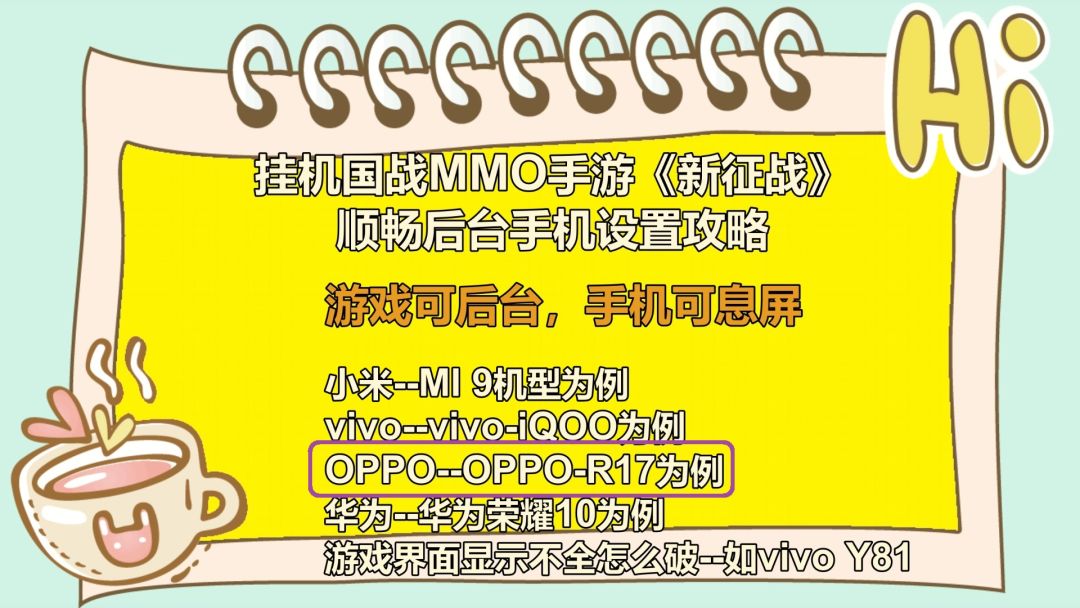 《新征战》的绝大多数任务活动都能挂机托管后台执行 手机只要不关机,自动完成自动收获经验、装备、金券、元宝券 彻底解放,完全不肝,躺平发育 你要动手做的只有激情的家族争霸个人争霸和帮战国战 新征战挂机托管功能如此强大,手机后台运行稳定至关重要。 视频以OPPO-R17机型为例,1分钟视频为大家讲解OPPO手机设置。 手机“设置”--电池--应用耗电管理-允许完全后台行为 1分钟视频学会手机设置,保证