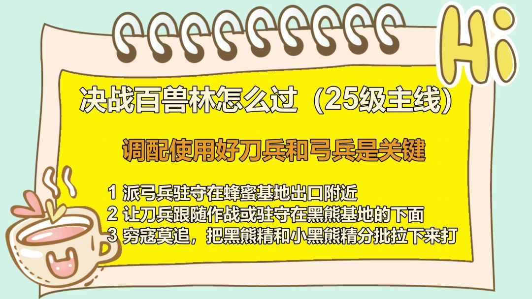 1 派弓兵驻守在蜂蜜基地出口附近 2 让刀兵跟随作战或驻守在黑熊基地的下面 3 穷寇莫追,把黑熊精和小黑熊精分批拉下来打 用好刀兵和弓兵,决战百兽林通关无压力#攻略#游戏安利#游戏讨论#宝藏厂商#游戏推荐