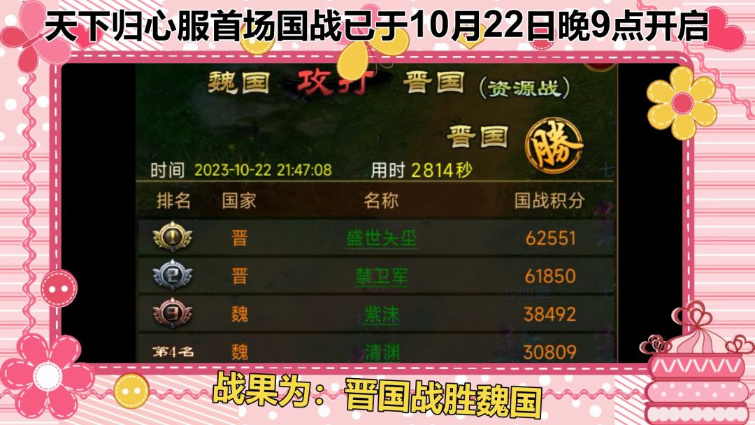 天下归心服首场国战已于10月22日晚9点开启 战果为:晋国抵抗魏国成功获得资源战胜利 恭喜晋国国王 盛世夨坕 获得新服国战首胜奖励--微信红包98元 恭喜魏国国王 清渊 获得新服首场国战对战国奖励--微信红包78元 更多挂机国战MMO手游《新征战》新服福利活动请至游戏专区: https://www.taptap.cn/group/187477/group-label/497220#国战#国战手游