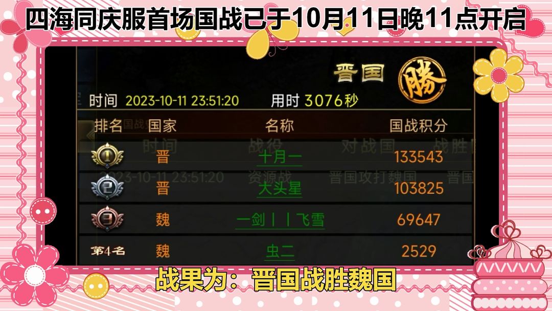 四海同庆服首场国战已于10月11日晚11点开启 战果为:晋国战胜魏国 恭喜晋国国王 十月一 获得新服国战首胜奖励--微信红包98元 恭喜魏国国王 一剑丨丨飞雪 获得新服首场国战对战国奖励--微信红包78元 恭喜 一剑丨丨飞雪 获得新服首场国战幸运星加送奖励--98元裂变礼包1枚 更多挂机国战MMO手游《新征战》新服福利活动请至游戏专区: https://www.taptap.cn/group