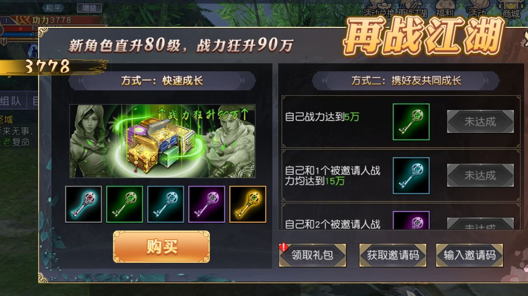 再战江湖是九阴3D手游中对目前新手或者新号来说帮助最便捷的一个玩法,它可以让你等级直接升到80级,节省了很多练级的时间,那么具体怎么使用呢,下面请听我细细道来。首先进去游戏之后,点游戏界面右上角活动那的再战江湖,进去之后点领取礼包,接着去自己背包里面找到那个礼包一打开,你就会立马升到80级传送到苏州安全区,然后你会发现包里有一些其他礼包和一个礼包2,以及四把钥匙,再战江湖可以开出6个礼包,每个礼包