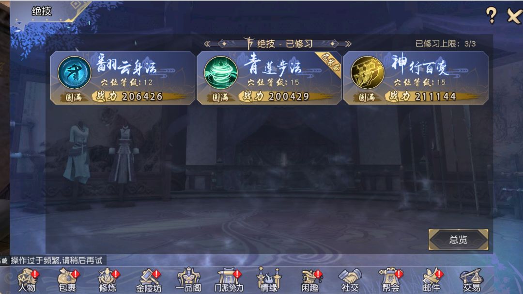 正经玩法是属于九阴3D手游之中大乘等级战力大幅度上升的一个玩法,不过这个玩法没有速成的,只能靠每天系统给的元气和北域活动兑换中的道具开出一些元气来升级,现在北域已经关闭,道具将会通过步武活动兑换或者商城购买,一阶技能书也能在步武中兑换,二阶只能黄金购买,进阶消耗如图