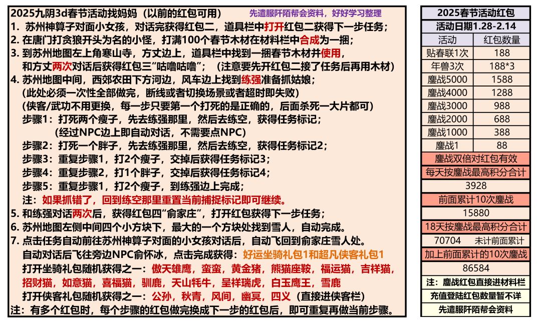 大家好,此图为九阴真经3D手游奇遇玩法攻略图,里面详细记录了全部奇遇的任务名称,所需材料以及任务完成后的奖励,供大家参考。(此图为先遣服好好学习大佬制作)