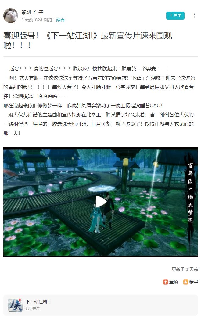 欢迎大侠们加入下一站江湖官方群: 978574834 各位大侠好: 目前《下一站江湖I》已进入如火如荼的上线准备之中,为庆祝江湖终于拿到版号,同时也为感激各位大侠一路来的风雨相伴,我们决定给大家赠送一波福利!话不多说,直接开冲! 【活动奖励】: 《下一站江湖I》兑换码一份 【活动规则】: 分享《下一站江湖I》主界面或者最新宣传片(如图), 链接:https://www.taptap.com/top